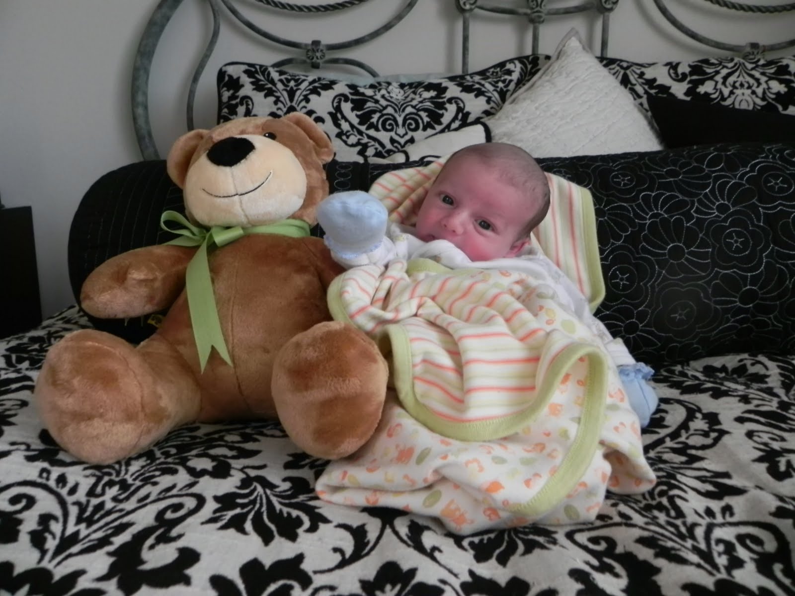 I'm one day late on this Post, but none the less I wanted to say our little Hayden is ONE MONTH OLD! And I cannot believe how the time has gone by so fast. Already he is growing, and getting so strong. He is so beautiful. My sister-in-law Val has inspired me to... copy her. She would take a picture of her little boy Isaac by a bear to show much he had grown. And well since I just think that is a great idea, I have decided to do it also. Thanks Val!